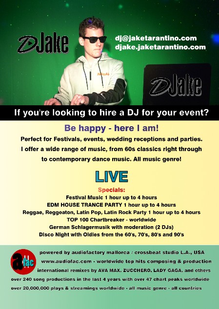 Dance party with DJAKE. 70's, 80's, 90's. The private dance event with moderation and a lot of fun. Alcoholic and non-alcoholic drinks, tappas and much more. The privat event is free of charge. Maximum 50 guests.